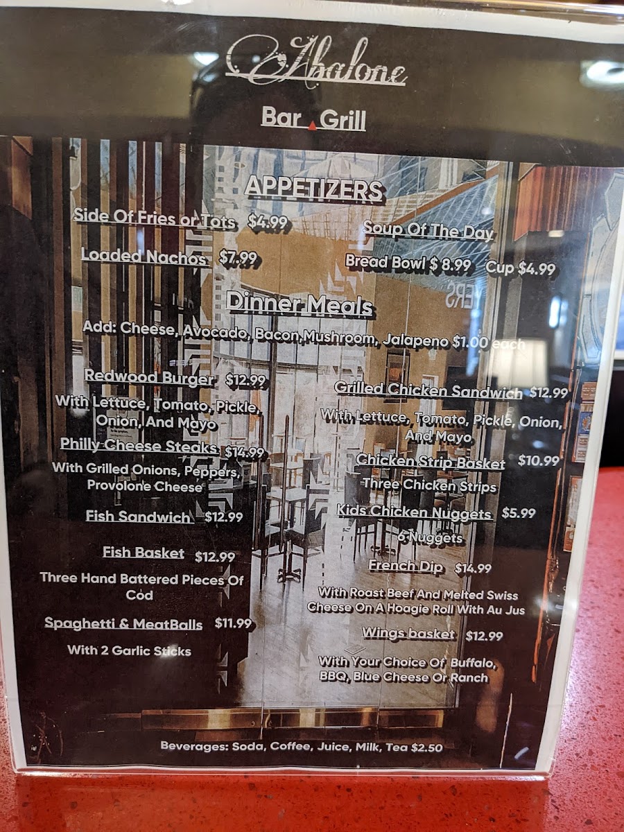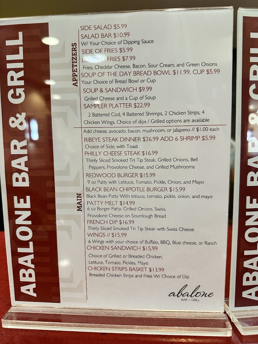 Welcome to Abalone Bar and Grill, a gem nestled at 171 Klamath Blvd in Klamath, CA. This cozy spot offers a delightful array of dishes that celebrate comfort food in a warm atmosphere. Start your meal with tempting appetizers like the Sampler Platter or the crowd-favorite Soup of the Day Bread Bowl, both designed to whet your appetite.
